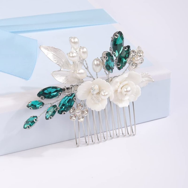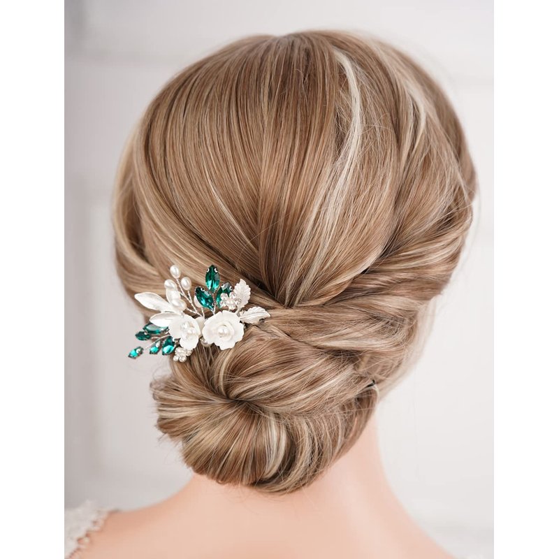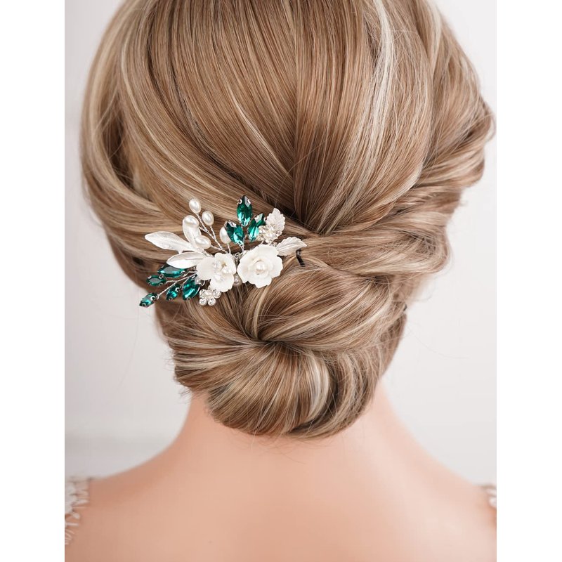 Missgrace Bride Wedding Crystal Pearl Leaf Rhinestones Hair Comb Green Bridal Hair Pieces Rhinestone Bridal Hair Clip Flower Hair Side Combs Wedding Hair Accessories for Brides Women (Silver) (Silver Green)