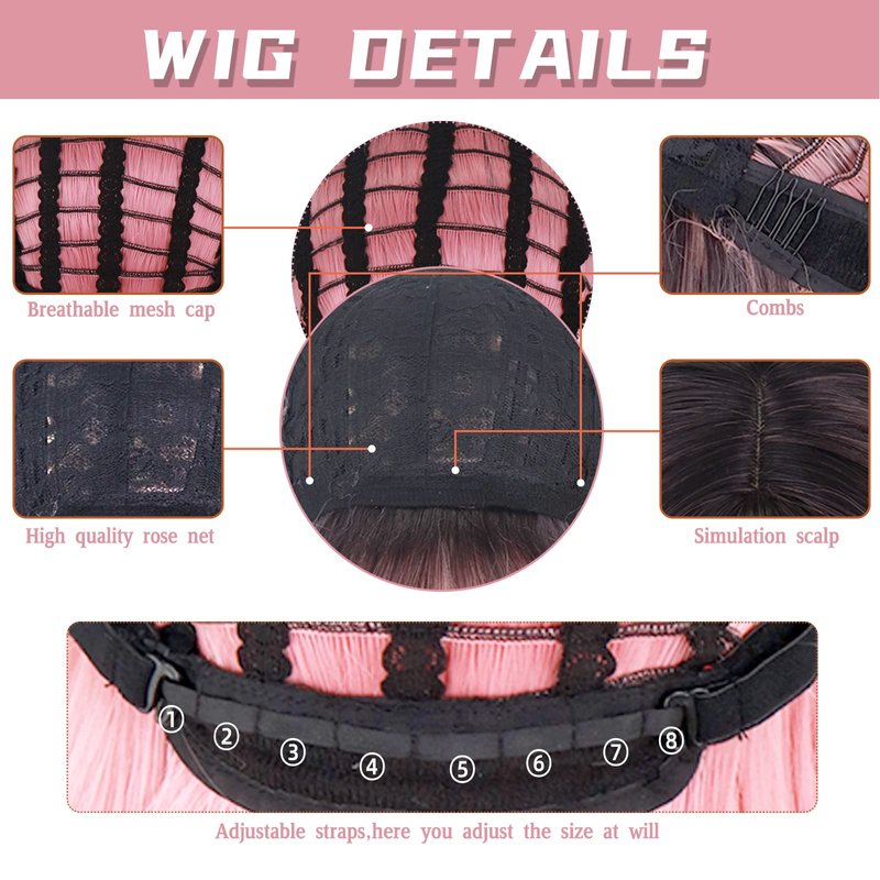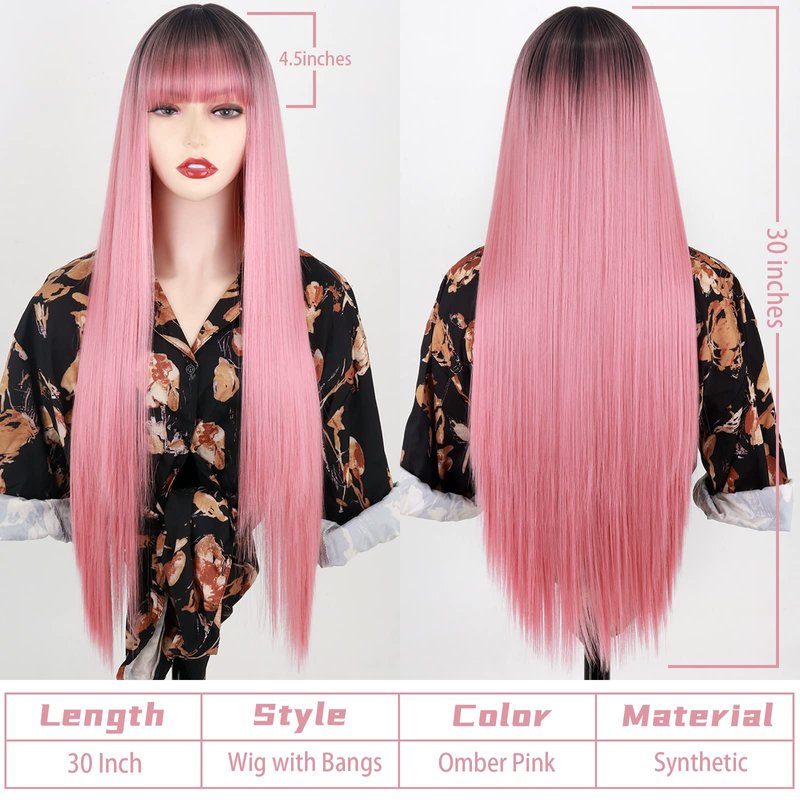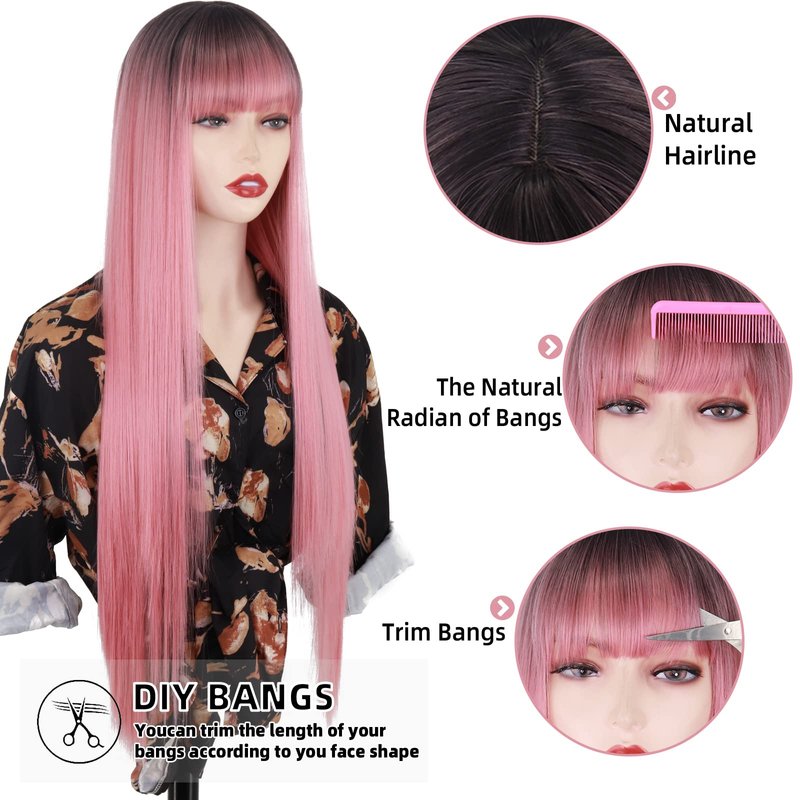 - Brand Assurance & Customer Service: brand quality guarantee. We are committed to providing all customers with a satisfactory shopping experience. Please contact Customer Service Team if you have any questions, we will always be there for you, and give you effective solutions within 12 hours.You can also cut & curl the pink long wig dark roots with bangs to fit your face.You can put concealer on the pink ombre wig parting space to fit your complexion.