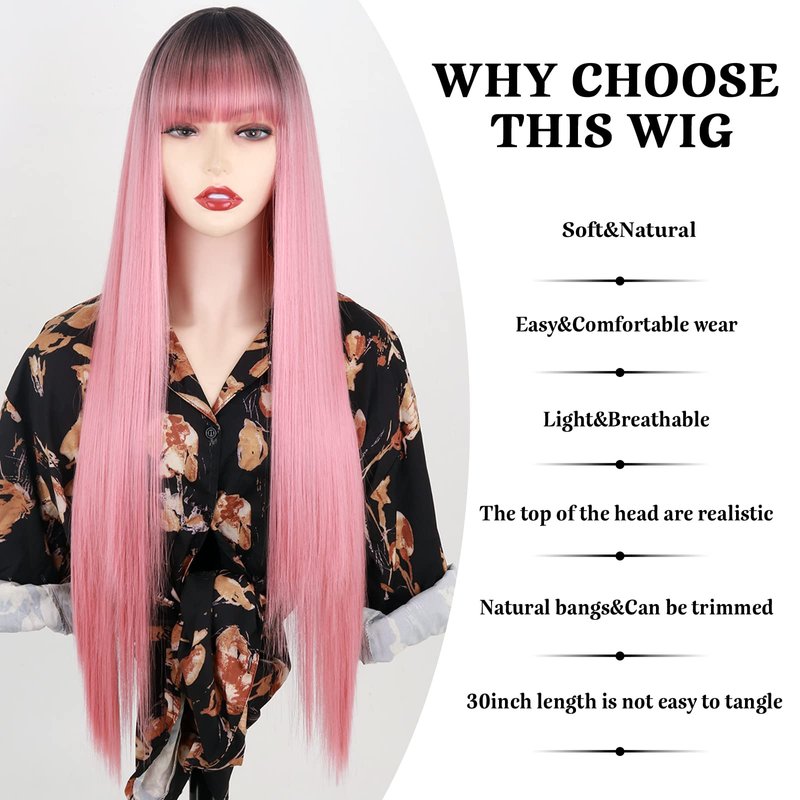 - MATERIAL: Long pink wig with bangs made of high quality synthetic hair, natural color looks like human hair, soft touching even better than your own hair, skin-friendly and soft hair made the straight Light pink wig long very comfortable. Light pink color and very stylish design with natural pretty looking and soft touch.In order to meet the needs of most people, wig bangs are relatively long. However, you can trim your bangs to your liking.
