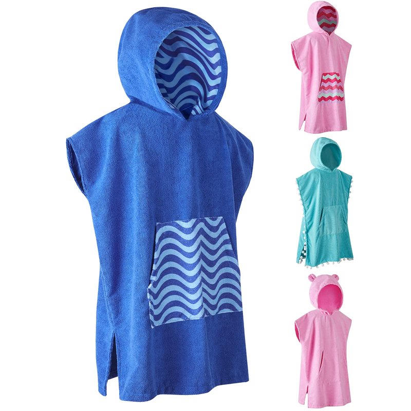 - [MULTI-PURPOSE] The kids hooded towelling robe is a perfect changing robe kids will love. Ideal for use at the swimming pool, beach, camping and outdoor changing. These pool towels for kids come with a hood, front pocket, teddy bear ears and a pom pom fringe all the cute elements that kids love. Keep your child comfortable at home and outdoors with this poncho towel for kids