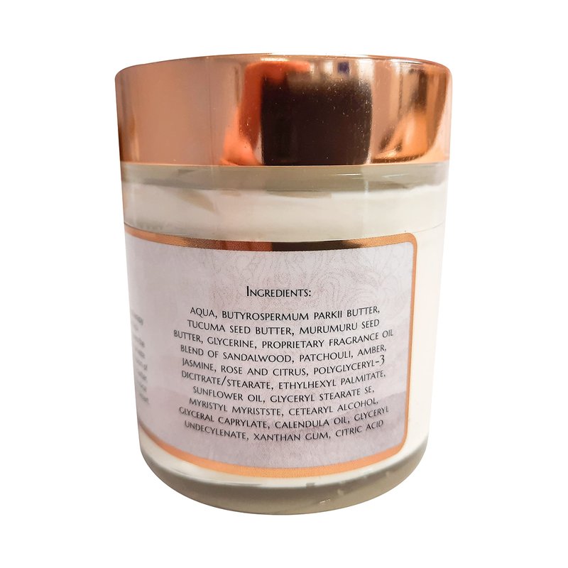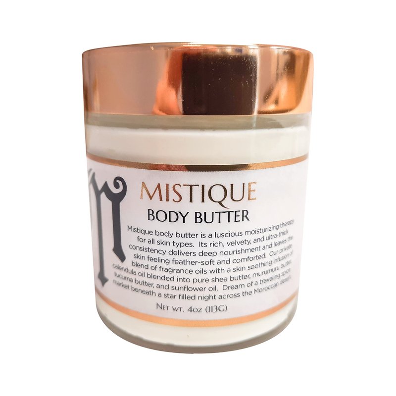 Mistique body butter, sandalwood, patchouli and spices, rich, all over body moisturizer with tucuma butter and deep skin conditioning