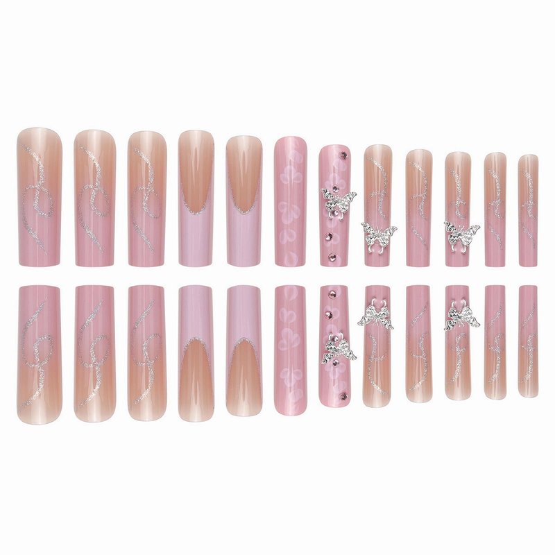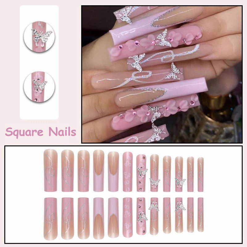 - 【Unique Design】 According to the most popular elements of the moment, these long square press on nails are designed with pink french tip, sparkly glitter sequins, cute flower and luxury butterfly diamond.