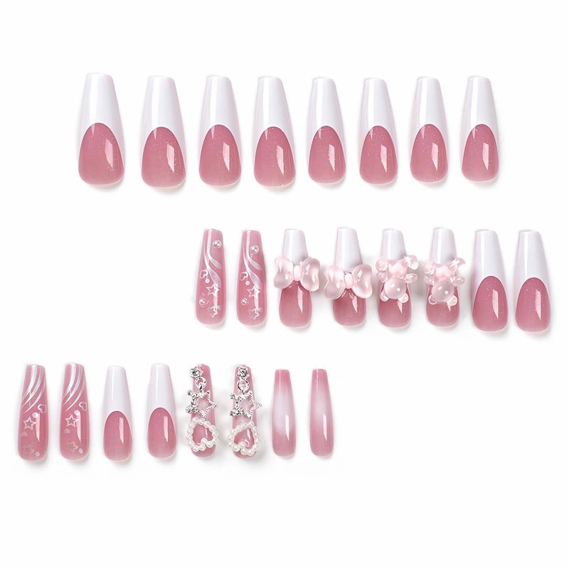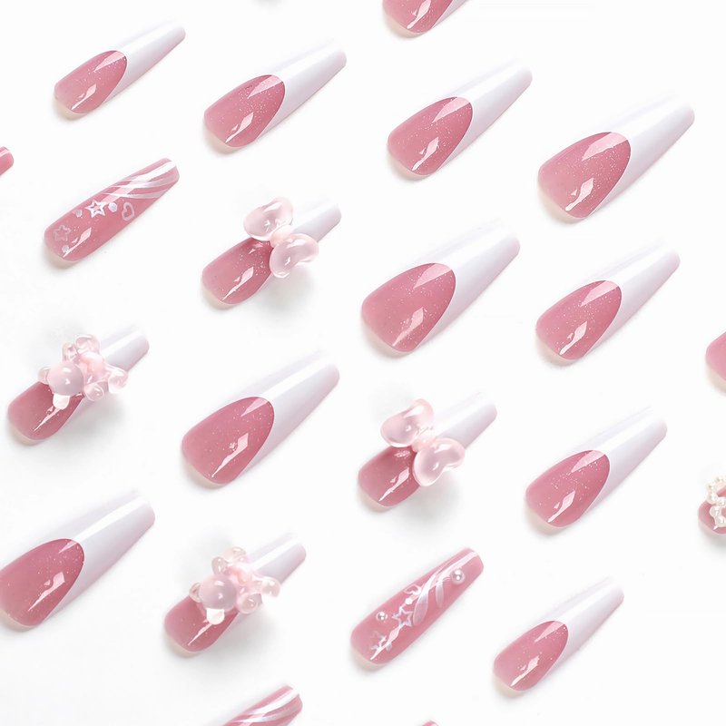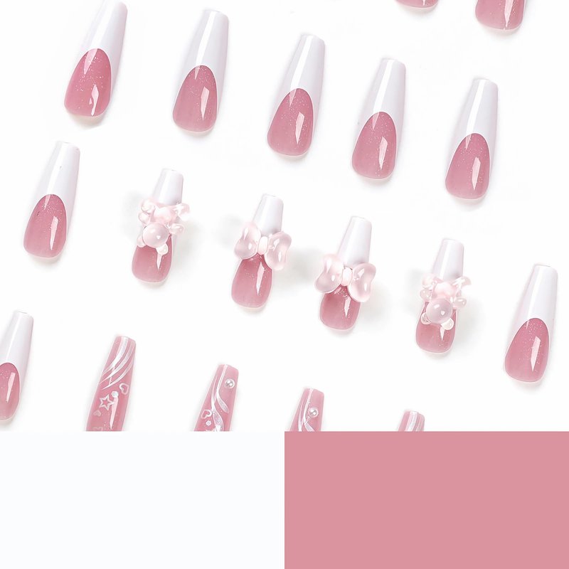 - 【Unique Design】 According to the most popular elements of the moment, these long coffin press on nails are designed with white french tip, pink gel, bling glitter, cute bow, pearl and 3d star diamond.