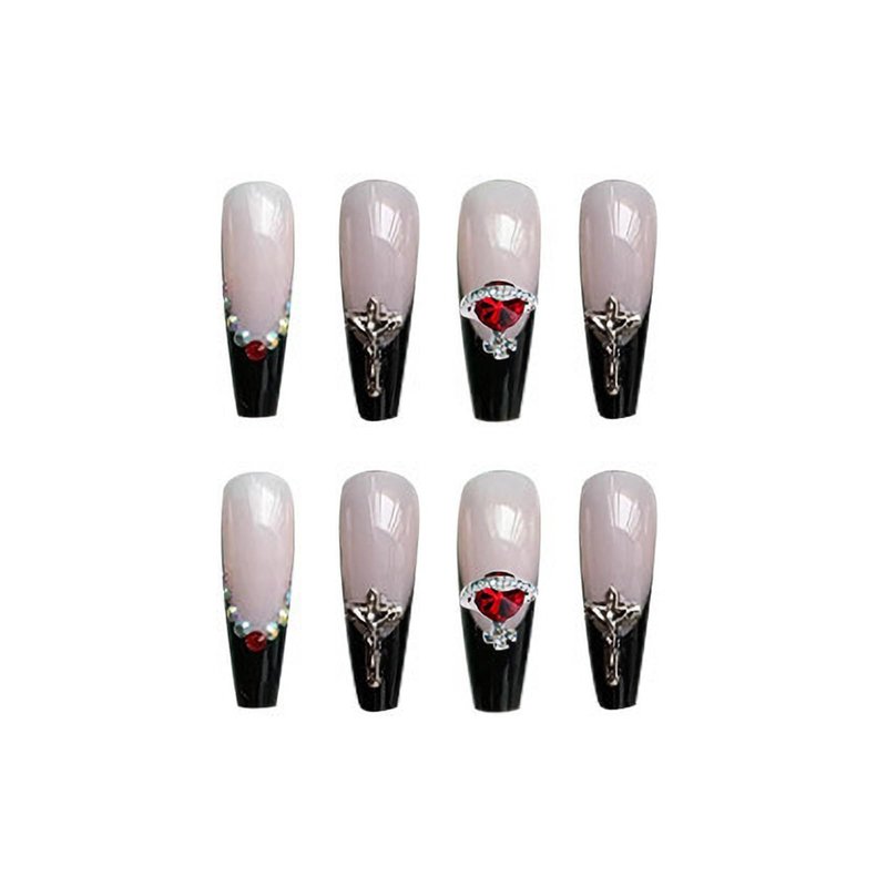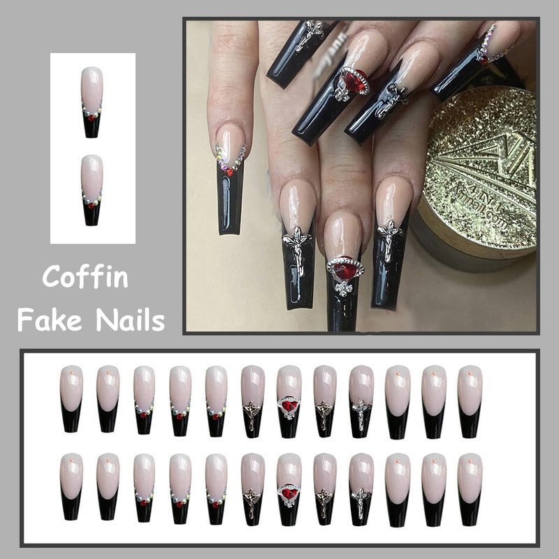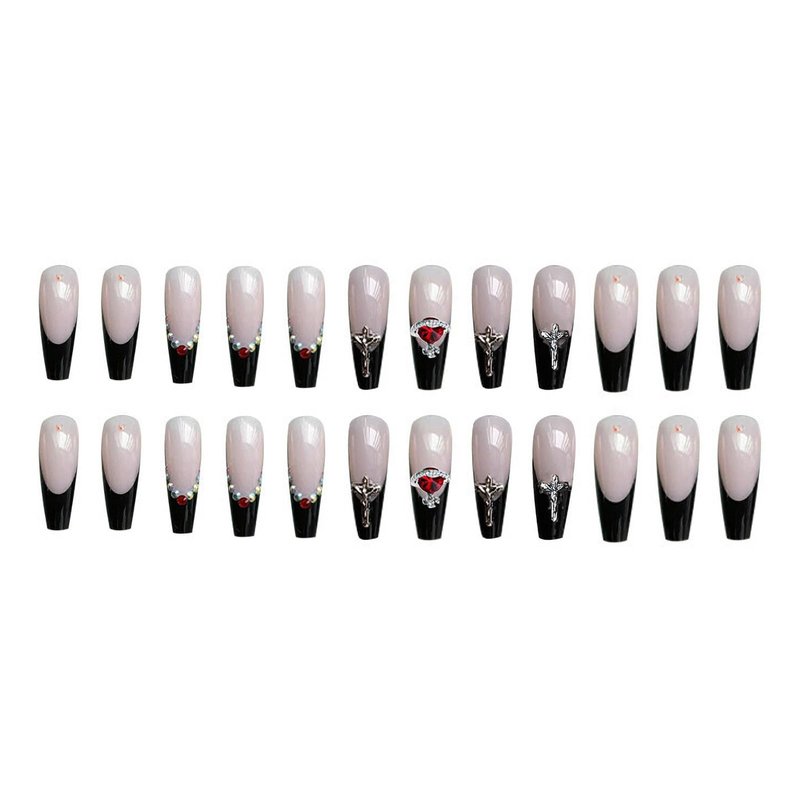 MISUD Press on Nails Long Coffin Fake Nails with Punk Designs Black French Tip Acrylic Nails Ballerina Goth Artificial Nails Glossy Glue on Nails Cross Rhinestone Stick on False Nails 24 pcs