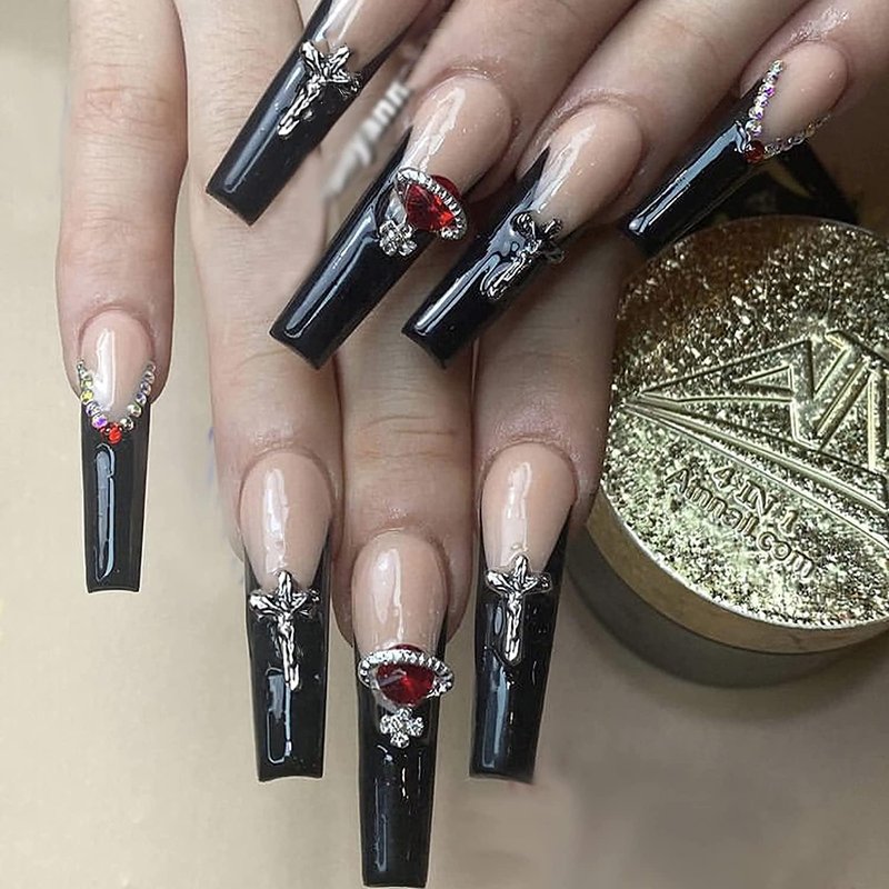 - 【Unique Design】 According to the most popular elements of the moment, these long coffin press on nails are designed with black french and punk rhinestone.