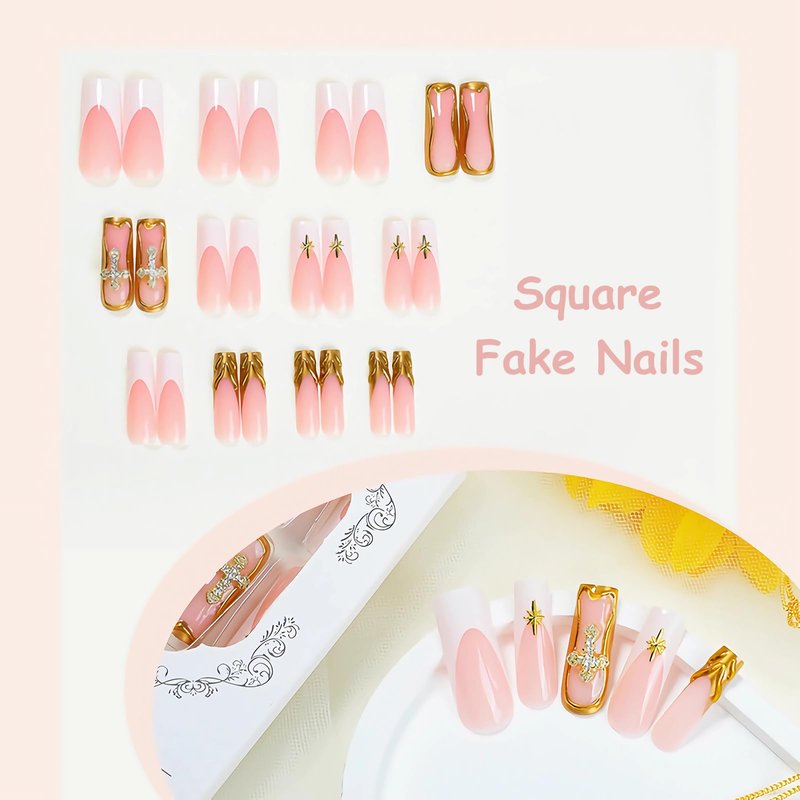 - 【Unique Design】 According to the most popular elements of the moment, these long square press on nails are designed with 3d gold french tip and luxury cross diamond.