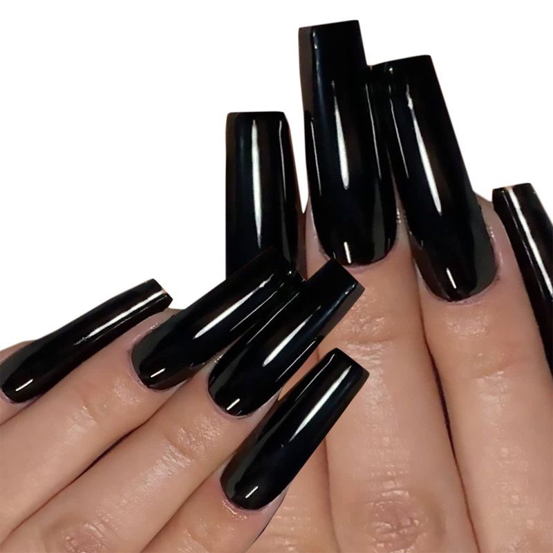 MISUD Square Fake Nails, Black Press on Nails, Glossy Squoval False Nails, Extra Long Artificial Glue on Nails for Women and Girls