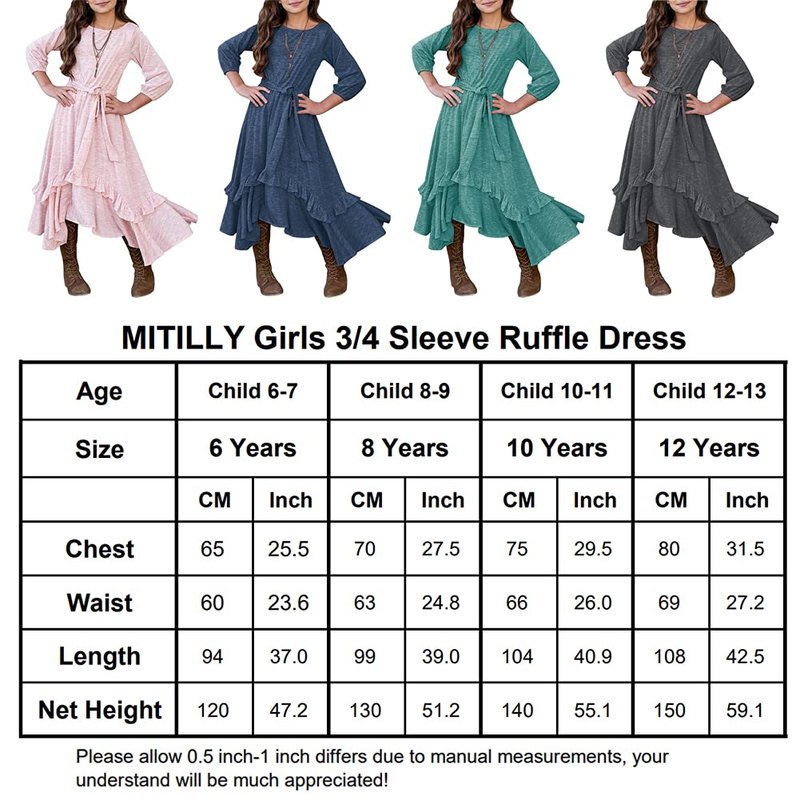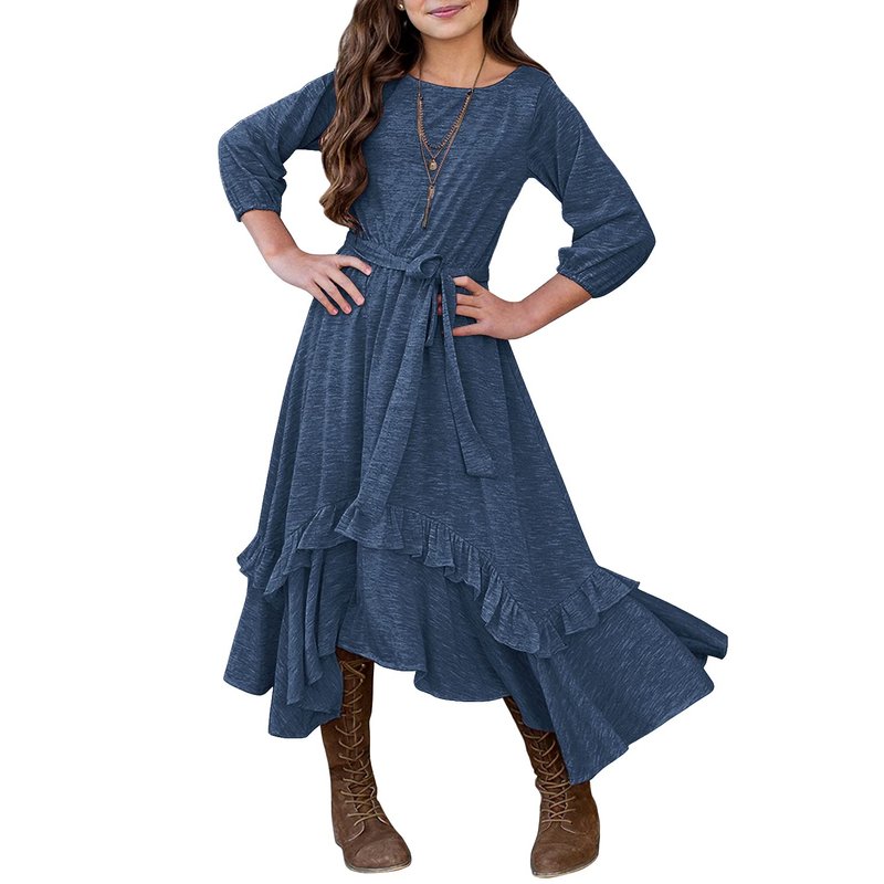 - Style: Casual, Crew neck, 3/4 Sleeves with elastic cuffs, Two side pockets, Elastic waist, Asymmetrical ruffle hem, Girls dress with belt.