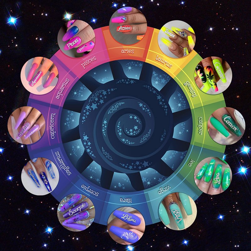 - Classic nail charms design: zodiac can reflect the sun position when you were born. It would relate with your character, personality, and emotions. Applied it to the nails, being mysterious and Individuality.