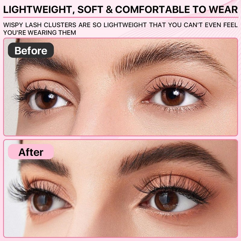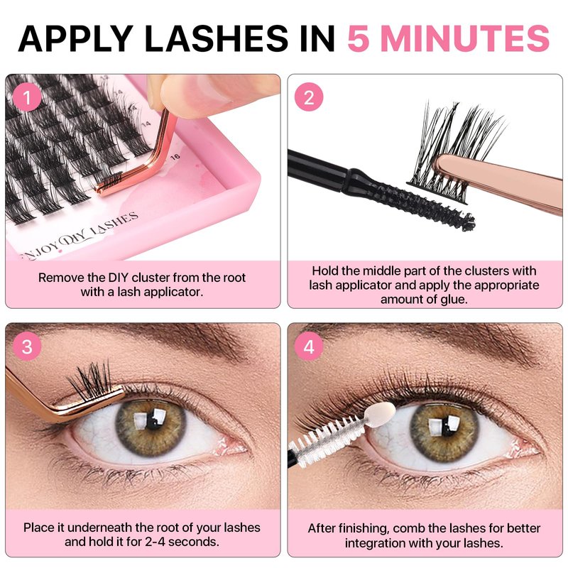 - Apply Lashes In 5 Minutes: Gently brush your natural lashes with lash bond, then place cluster underneath your natural lashes for a comfortable and natural look, squeeze clusters against your lashes, wait 15s and apply lash seal to lock the bond