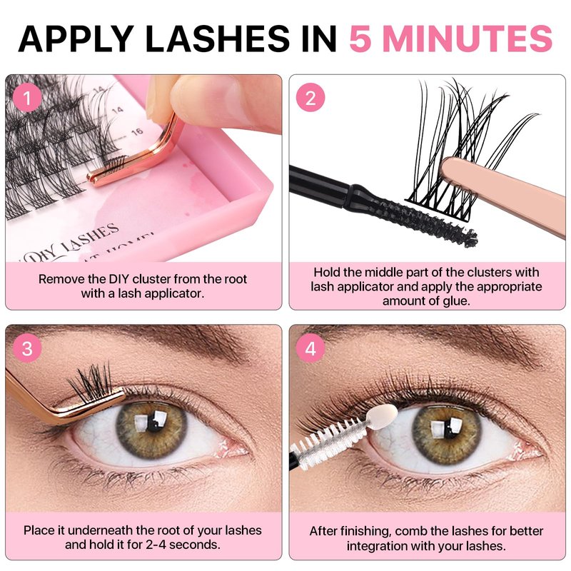 - Apply Lashes In 5 Minutes: Gently brush your natural lashes with lash bond, then place cluster underneath your natural lashes for a comfortable and natural look, squeeze clusters against your lashes, wait 15s and apply lash seal to lock the bond.