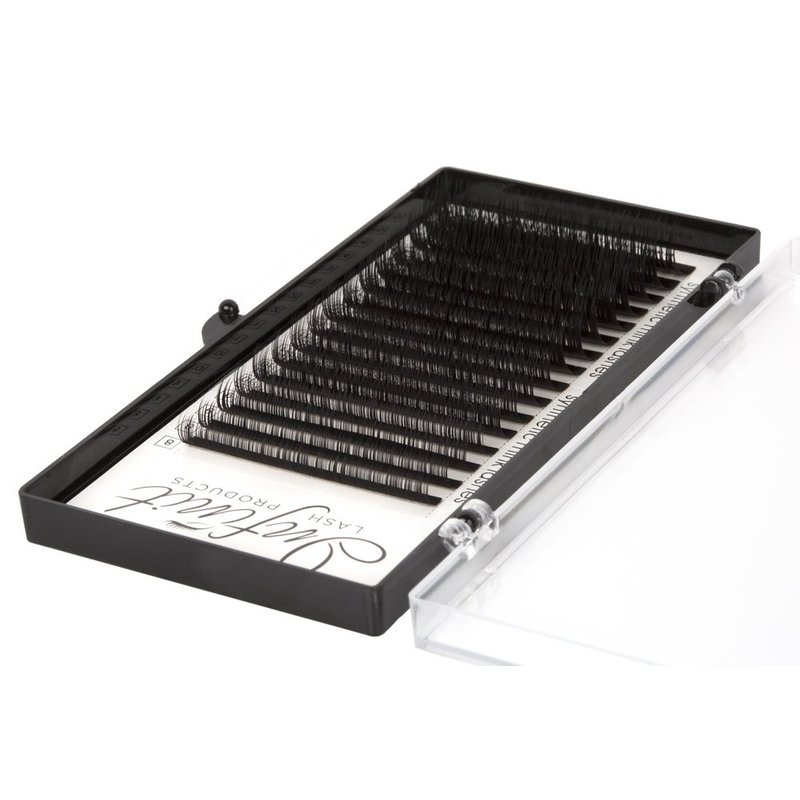 Faux Mink Lashes are precision manufactured from sterilized PBT materials and have a deep, rich black finish. They boast a semi-matte finish, and are incredibly flexible. Our synthetic mink lash extensions are tapered 2/3 to give a full look through the body of the extension, providing a full lash look. Double heated for amazing curl retention and consistency.