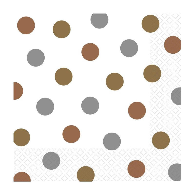 Add some color to the table with our Mixed Metallic Dots Luncheon Napkins! Features a bronze, gold, silver, and white polka dot pattern. Measures 6.5" x 6.5". Includes 16 - 2 ply paper napkins per package.