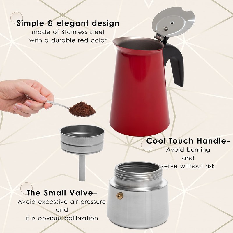 - Stainless Steel Moka Pot: The stainless espresso maker stove top is made from heavy-duty stainless steel & a non-reactive interior suitable for all heat sources, including gas, ceramic, or electric stove.