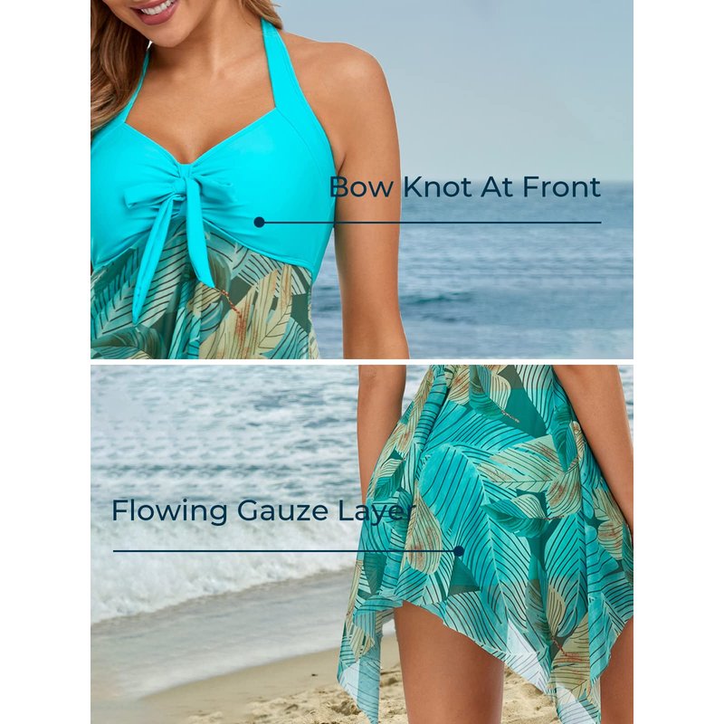 MiYang Women Tankini Swimdress with Boyshorts Two Piece V Neck Bowknot Halter Bathing Suit Dress Green Flower