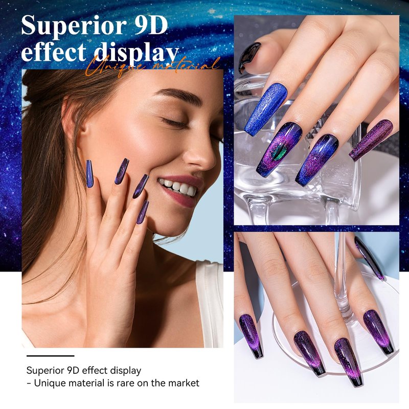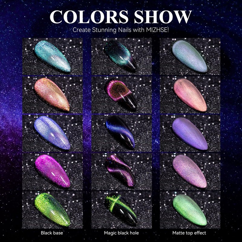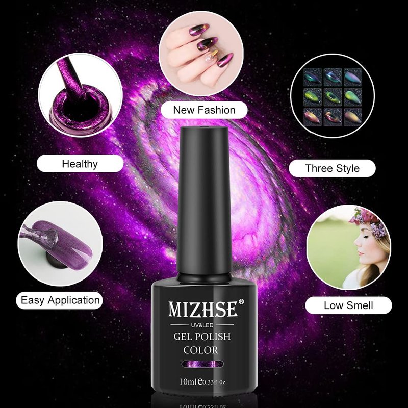 - 🐱👁【Charming Effect of Cat Eye Gel Nail Polish】Chameleon color with cat eye effect and holographic shimmer with galaxy effect. Tips: Mix Our magnetic nail polish gel color, and you will get amazing results! Attractive color changing and cat eye effect will surprise you. Different effects depend on different lights and angles!