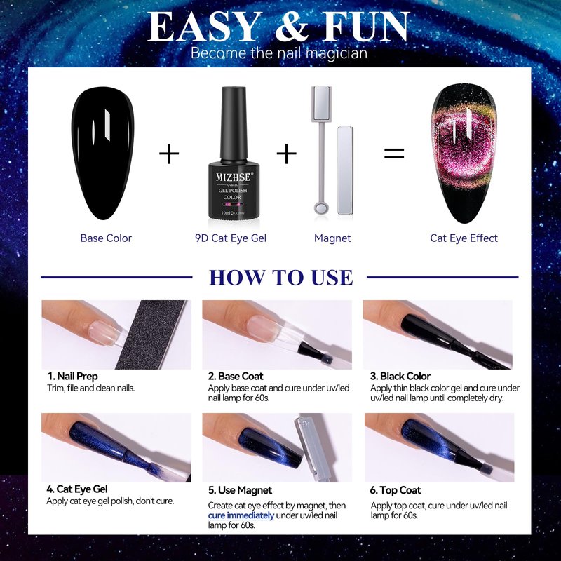- 🐱👁【Warm Tips of Magnetic Gel Polish】♥♥Please be sure to contact us if you have any questions!!! We will spare no effort to help you!!!♥♥ Base and top coat required. Apply black nail gel as a base color. Suggest to apply 2-3 layers of cat eye gel polish to get desired saturation. Make sure that each layer is thin and completely dry. Enjoy professional-level nail art & care with MIZHSE's cat eye gel polish and click "Add to Cart" now.