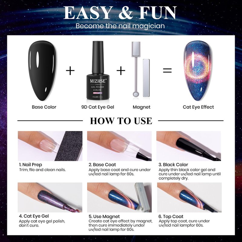 - 【Warm Tips of Magnetic Gel Polish】♥♥Please be sure to contact us if you have any questions!!! We will spare no effort to help you!!!♥♥ Base and top coat required. Suggest to apply black nail gel as a base color to get more obvious effect. ♥♥Make sure that each layer is thin and completely dry. Enjoy professional-level nail art & care with MIZHSE's cat eye gel polish and click "Add to Cart" now.