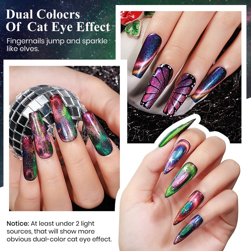 - 【Dual Colors Effect and Large Capacity】Chameleon color with dual colors cat eye effect and holographic shimmer with galaxy effect. Attractive color changing and cat eye effect will surprise you. Different effects depend on different lights and angles! Large capacity and durable, choose it to get healthy beauty on your nails.
