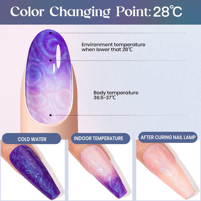- 💕 【Long Lasting & Healthy Resin】This Color Changing nail polish can keep about 3 weeks long lasting with proper application. Made from healthy and natural resin, the non-toxic ingredient is not harmful to skin and low odor.