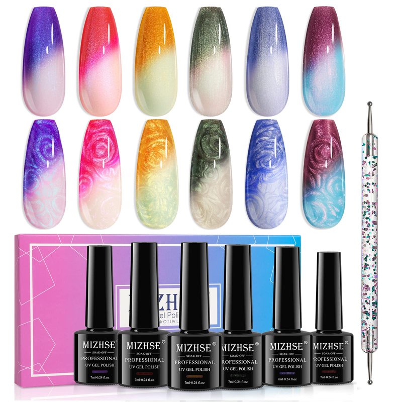 MIZHSE Color Changing Nail Polish Pearl Mood Changing Nails Polish Glitter Drawing Shell Thread Soak off UV LED Glitter Thermal Nail Gel Polish for Nail Salon Home DIY Manicure Set 6 Colors
