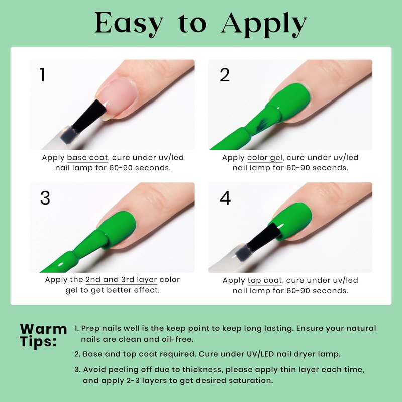- Healthy Ingredients: Made from natural resin which is healthy, low smell, non-toxic, cruelty-free and environmental. We choose salon-quality ingredients, that can be easy to create more delicate and shinier nail effect.