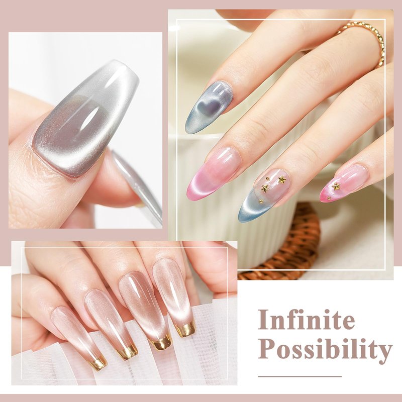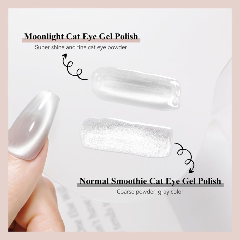 - UPGRADED CRYSTAL CAT EYE: Ultra fine magnet powder, more delicate cat eye powder offer double bright effect and ceramic like texture. Use Silver Cat Eye Gel to lie over sheer jelly colors for stylish cat eye designs