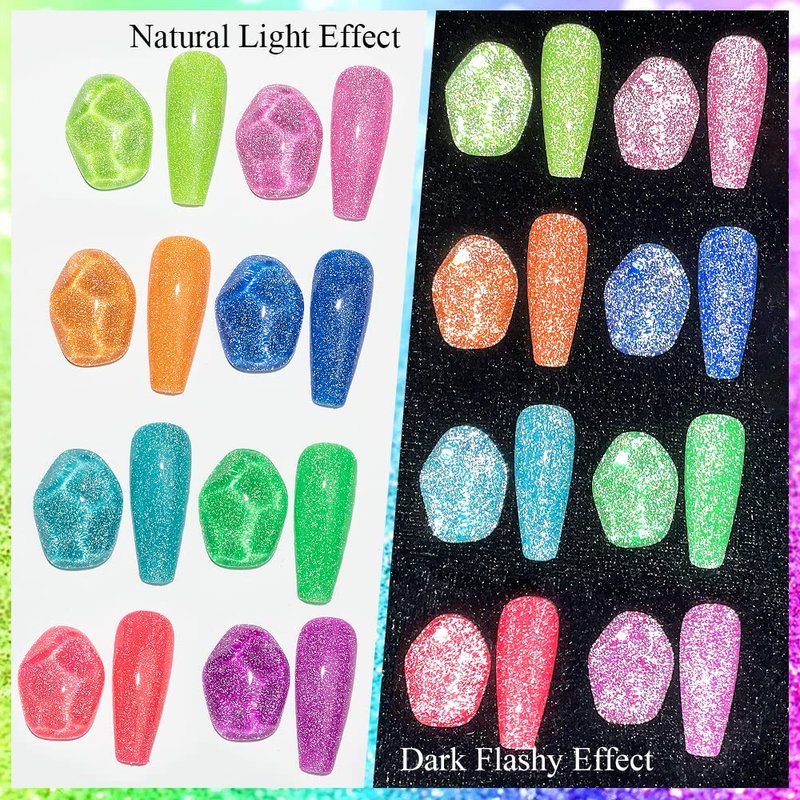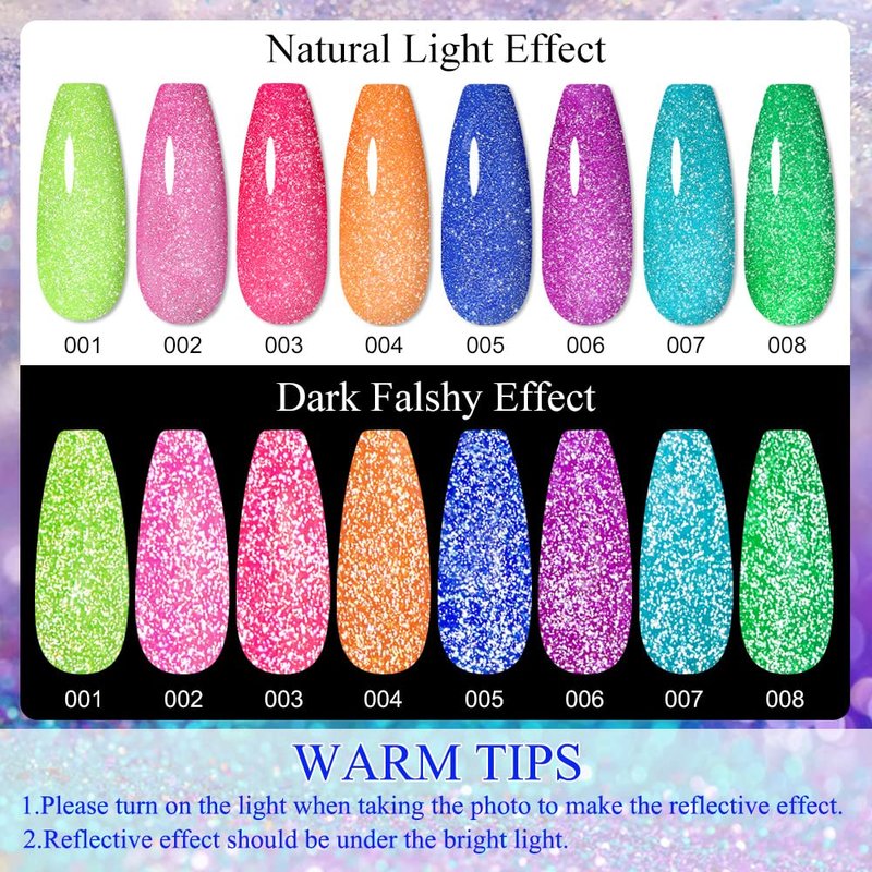 - Package Contents: 6 Bottles 7ml neon reflective gel polish.Two charming effect natural light normal effect and flashing disco Effect. Not only suitable for daily life but also for parties attractive and different effects will surprise you.