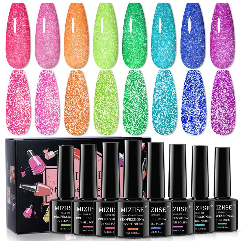 MIZHSE Neon Reflective Gel Polish Set,Sparkly Shiny Disco Shimmer Nail Polish Gel Kit Fluorescent Bright UV LED Soak Off Glitter Nail Gel Polish for DIY Nail Art Salon