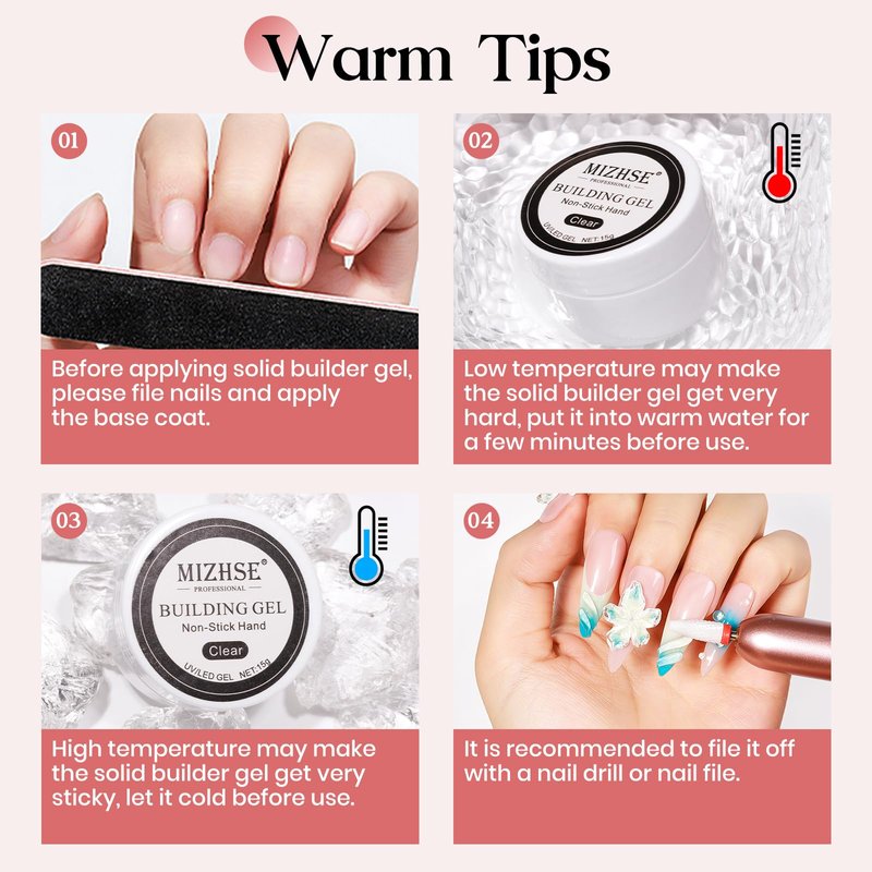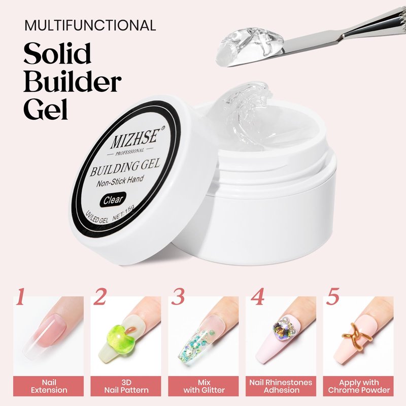 - Solid Builder Gel for Nails: MIZHSE new upgraded solid builder gel contains 1*15 g non-sticky hard gel, 1*mini LED light. Gone are the days of complicated nail extension processes. Our solid hard gel simplifies the art of nail extensions, making it accessible for everyone while maintaining salon-quality results. Achieve beautiful and strong nails anytime and anywhere. Easy to apply using your finger, it's perfect for both nail beginners and seasoned pros.