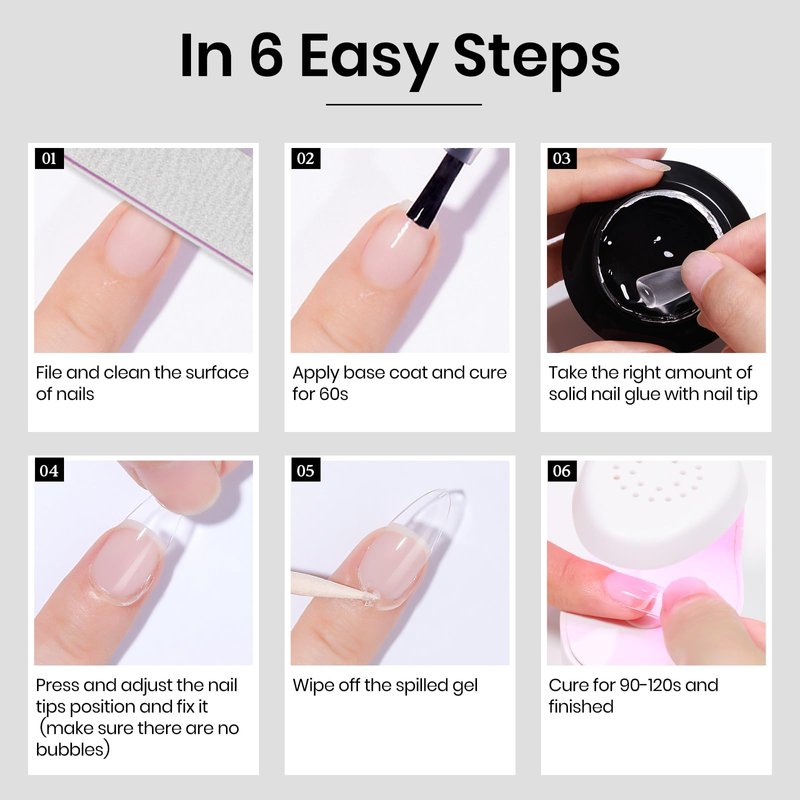 - Friendly to Beginner and Need Curing: No need to use a brush, just use the nail tips to take the right amount of gel. Non-stick texture, will not get your hands dirty, and can be adjusted to the position of the second time. Tips: After nail preparing, it's essential to apply a base coat,and required nail lamp cured