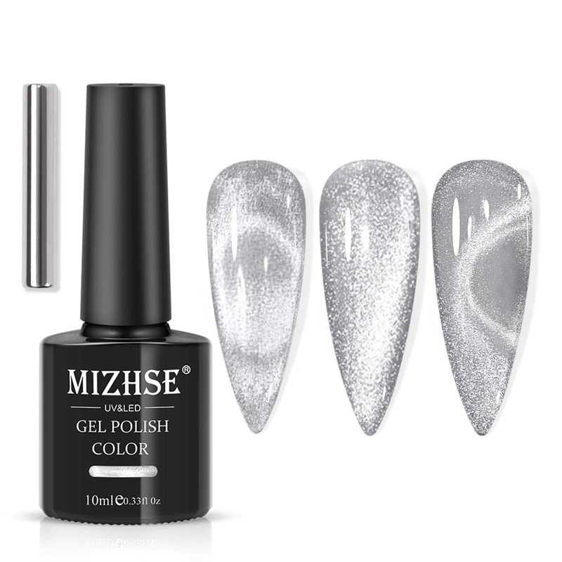 - Magnetic Gel Polish Nail Art: 1 x 10 ml (0.33 fl oz) silver cat eye gel polish, 1 magnetic stick. The cat eye nail gel allows you to create many kinds of charming effects. Suitable for natural nails, UV gel nails, false nails, acrylic nails, etc.