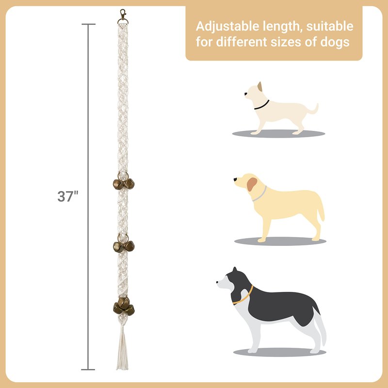 - Adjustable to Any Length : The 37"L doorbell rope of the dog training bell can be adjusted freely by buckling the top metal clip to any holes on the cotton cord, suitable for different sizes of dogs to touch with head or paw. A perfect gift for dog trainer and dog owner.