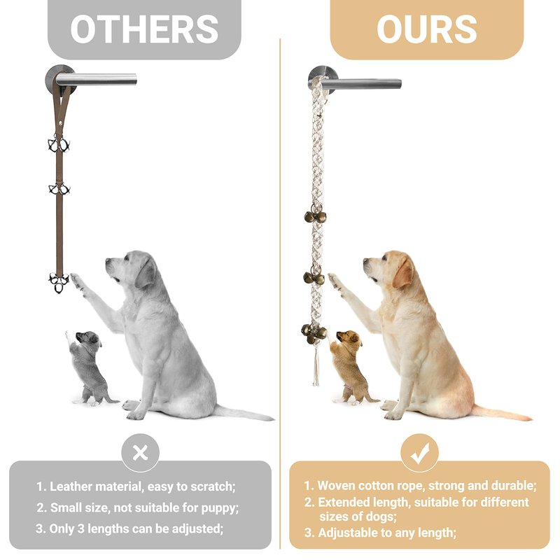 - Friendly Communication : This dog door bell can help you train your family's best friends. Housebreak and teach your puppy to ring the bells as a signal that they want to potty or go outside! Using dog bell is a win-win way for your dog to communicate instead of barking and scratching.