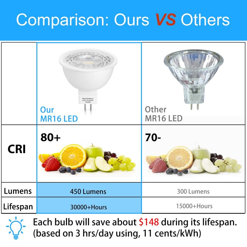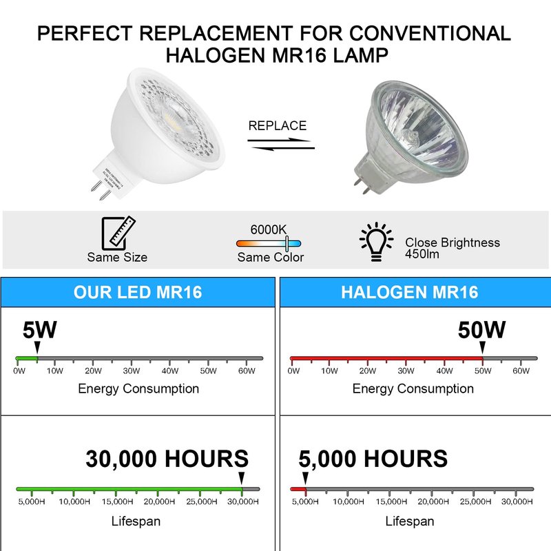 - Reduce cost and trouble of changing light bulbs: Our MR16 5W LED bulbs with the bulb lifespan over 30,000 hrs, which could last very long time, save effort and maintenance costs on changing bulbs frequently. You could replace the MR16 20W 35W 40W traditional halogen bulb by only 5W LED