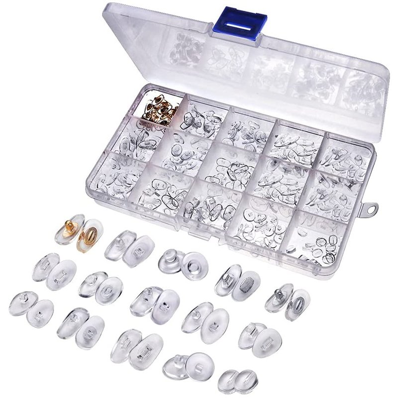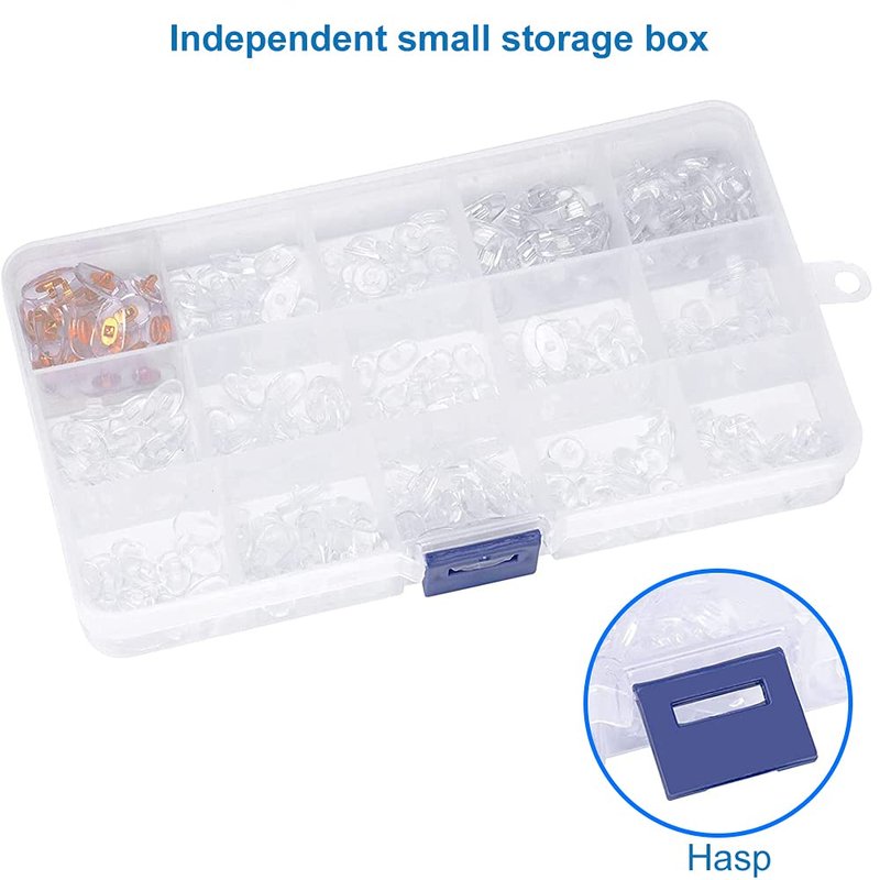 - One complete set: This Universal 15 styles Eyeglass Nose Pad Replacement Kit comes in a Sturdy Plastic Transparent storage box that keeps all your Nose Pads organized and in one place without losing them.