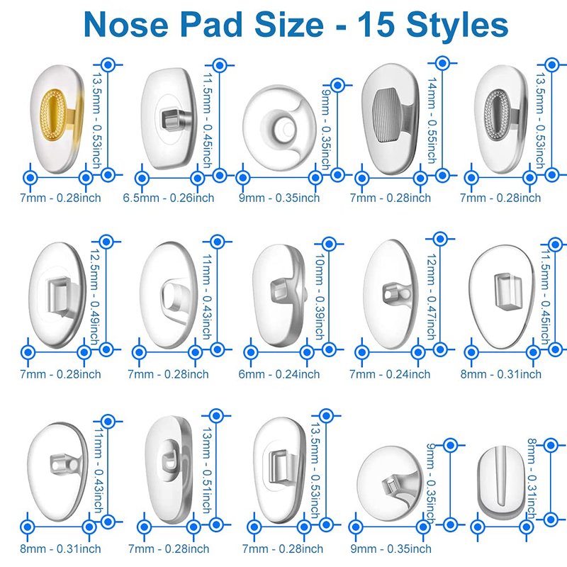 - Material: 150 Nose pads in 15 assorted Sizes. These Eyeglass Nose Pads are made from Soft Surgical Eco-Friendly Silicone that is Allergie free, which is non-slipping and elastic. with its D-Shaped ergonomic design, these nosepads will give maximum comfort while wearing your glasses. They will make the Eyeglasses fit better, not hurt the bridge of your nose and prevent your glasses from slipping off. Each style is transparent and is barely noticeable when worn.