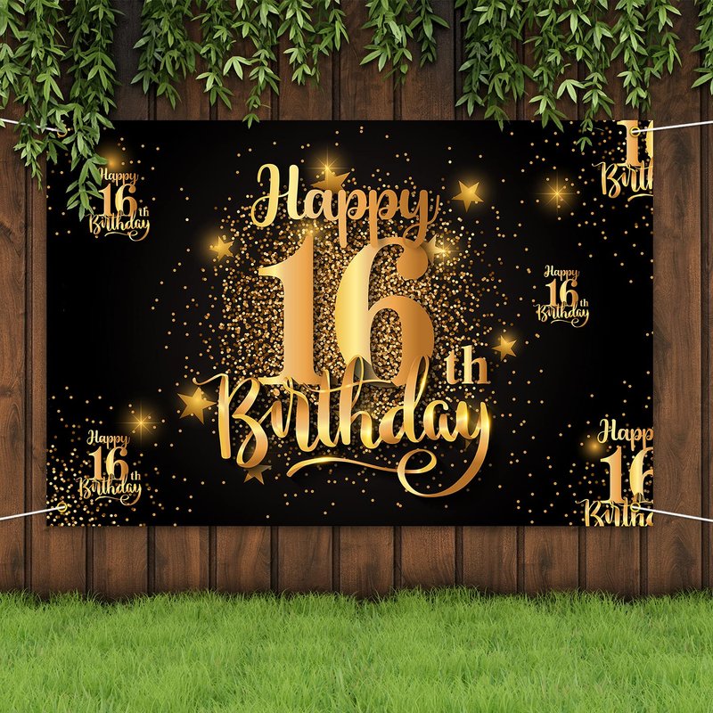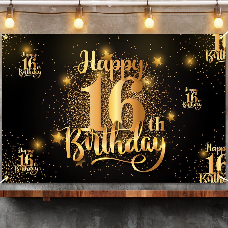 Mnixy Happy 16th Birthday Backdrop Banner Step and Repeat 16 Years Old Background Decorations for Women Men Her Him Photography Party Supplies Glitter Black Gold