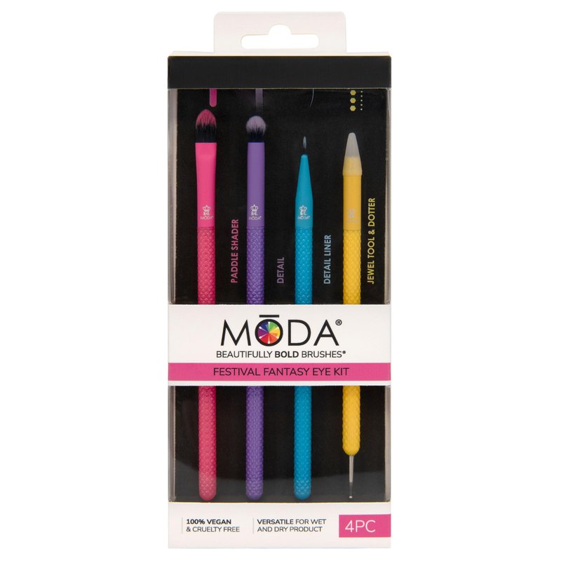 Self-expression takes center stage! Create fun and fierce festival looks with the MODA Festival Fantasy Eye Kit. These five fabulous tools are perfect for graphic liner, dotting, detailing, and adding gems for bold, artistic eye looks. Includes paddle shader, detail, detail liner, jewel tool, and dotter.