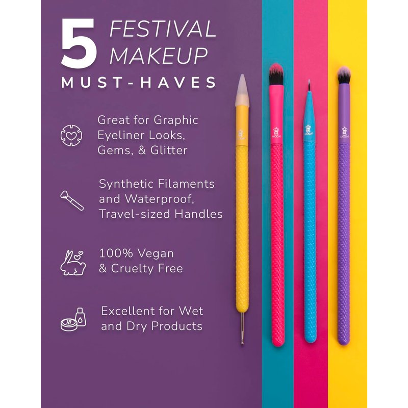 - Self-expression takes center stage with five bold, vegan brushes perfect for graphic liner, precise detailing, and adding gems for show-stopping festival eye looks.