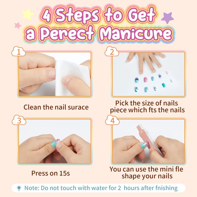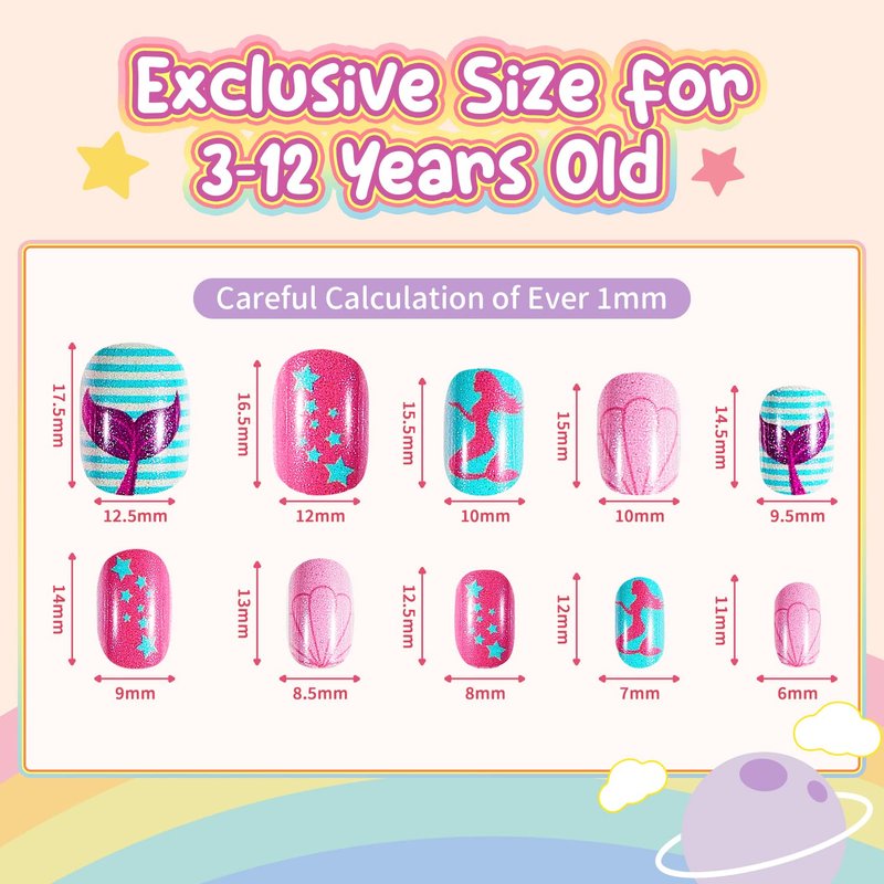 - 【Varied Size & Easy to Apply】The 144 pieces of kids' artificial nails offer 12 different sizes, so they're easy to keep track of, and convenient to choose the suitable size that fits every finger. You do not need to apply gel polish or nail polish and get impressive & wonderful nails.