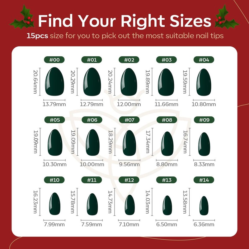 - 30 pcs Nails in 15 Sizes: The green press on nail kit comes with 30 pcs fake nails in 15 different sizes to suit each finger, each set comes complete with a nail glue, 2 sheets jelly adhesive tabs, double-sided nail file, cuticle stick, and alcohol pad.