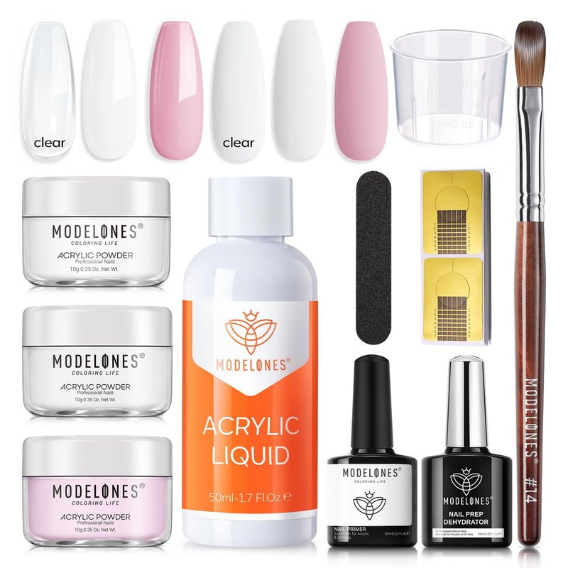 - 【Great 3 color acrylic nail kit for beginners】:modelones nail acrylic kit includes 3 colors acrylic powder, 50 monomer, 10ml nail dehydrator and primer and complete acrylic nail tools (acrylic nail brush, picker dotting nail pen, nail form, nail file and dappen dish). All tools that beginners need are included in modelones nail kit acrylic nail kit;