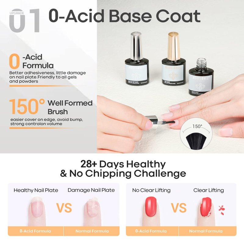 - ❤ MODELONES BASE COAT AND NO WIPE MATTE SHINE GEL TOP COAT SET: You will get 1*10ml Base Coat+ 1*10ml No Wipe Shine Top Coat+ 1*10ml Matte Top Coat with gift box. It is normal for a base coat and color gel to remain a little sticky after curing. No worry about that. It would have better adhesion between nails and gel layers. The top coat would seal it. (Please do not over-cured it or it would peel off easily).
