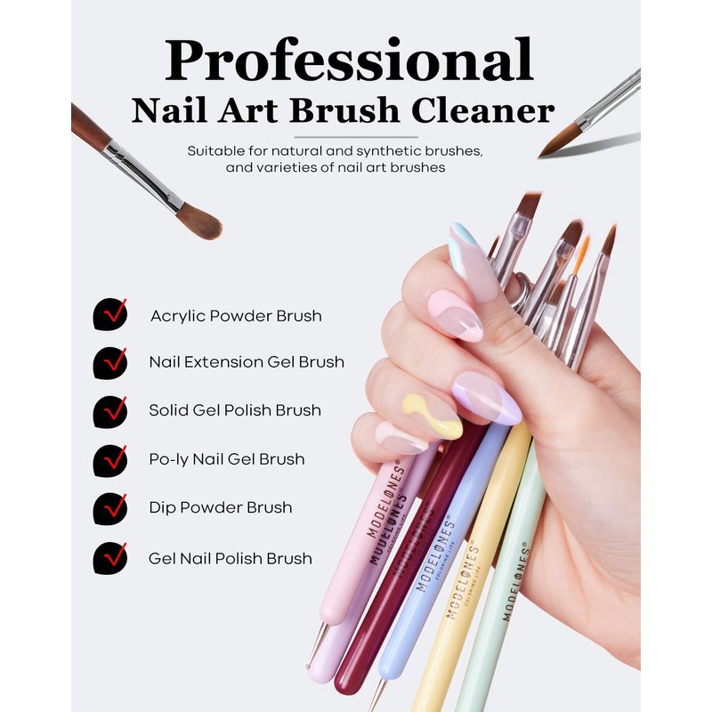- đăSuper-Powerful Cleaning & Dissolvingă (Contained 1* Cleaner 80ml+1* Brush, no glass cup) Modelones cleaning solution packs some serious punch with organic solvents that can get the job done right! It'll clean up your nail brushes in no time and dissolve all kinds of tough gel residues like solid gel, gel nail polish, extension gel, poly nail gel, acrylic powder, and dip powder.
