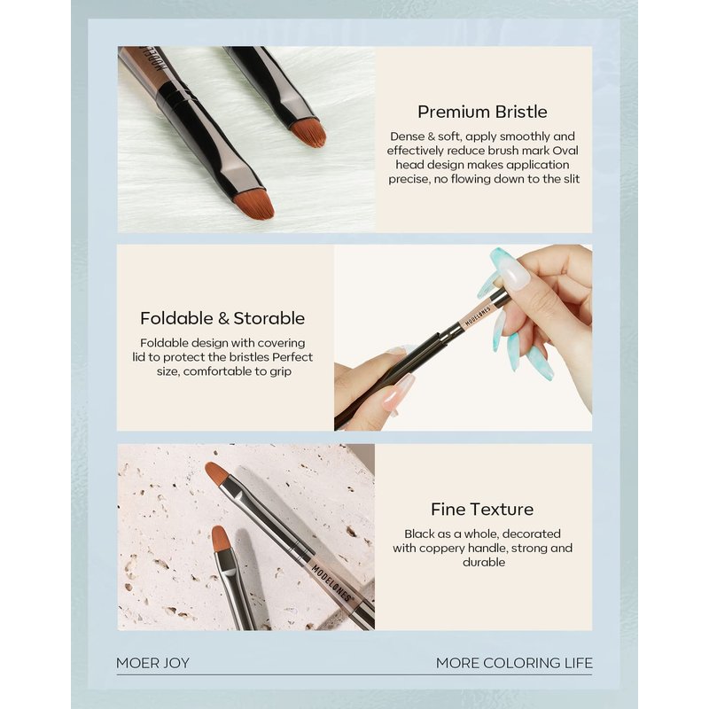 - đ ăUpgraded Professional Nail Art Brushă1. #Upgraded Premium Bristle#: Dense & soft, apply smoothly and effectively reduce brush mark.Oval-head design makes precise application, no flowing down to the slit; 2. #Foldable & Storable#: Foldable design with covering lid to protect the bristles. Perfect size,comfortable to grip and storable; 3. #Upgraded Design#: Black as a whole, decorated with coppery handle, strong and durable.