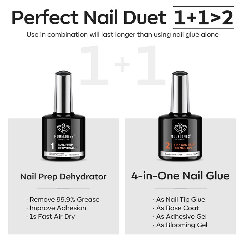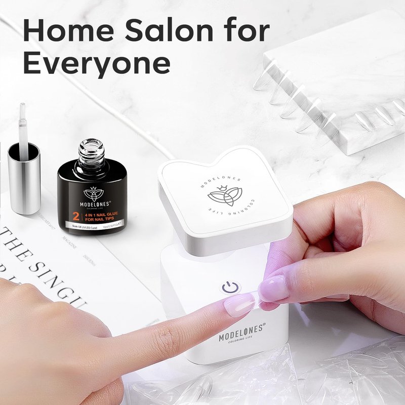 1. Modelones all-new Nail Tips & Glue Gel Kit includes 1*Ultra-Portable U V/LED Nail Lamp, 1*10ml4-in-One Nail Glue Gel, 1*10ml Nail Prep Dehydrate, 500pcs Coffin Nail Tips, 1*Nail File, and 1*Nail Tips Clipper! The Newest, The Fastest, Most Professional, Nail enhancement for all of your nail art needs in 2021 New Nail Art.
