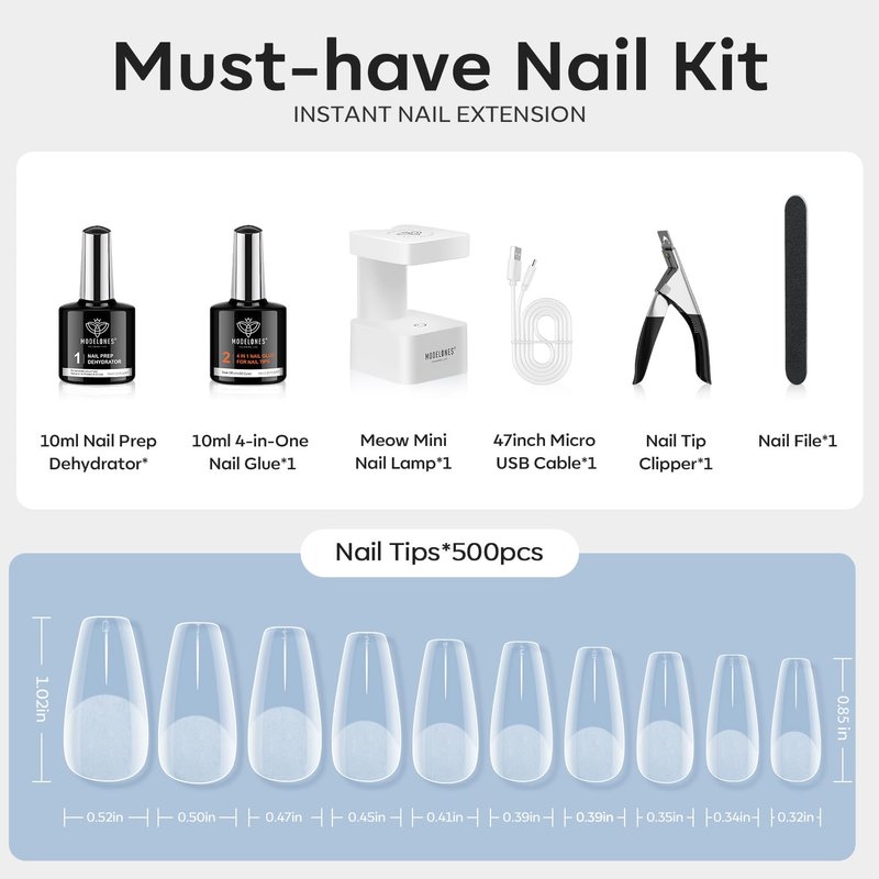 - Salon at Home: Modelones Gel Nail Extension Kit includes 1* 10 ml 4-in-One Nail Glue Gel, 500 pcs* Half Matte Medium Coffin Nail Tips, 1* Ultra-Portable U V / LED Nail Lamp, 1* 10 ml Nail Dehydrator, 1* Nail Tips Clipper and 1* Nail File ! Our gel nail kit is convenient for you to polish the look you’ve always dreamed of, and achieving the best modern salon-looking gel mani at home with a small fee