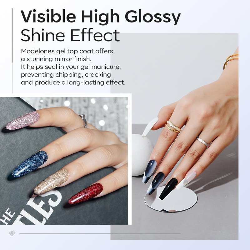 - 【High Gloss Finish】Modelones nail top coat makes the nail color moist and translucent, presents an extra high-glossy effect, and enhances the vitality of the nail color. The self-leveling properties of the gel polish top coat help create an even and polished flawless look.