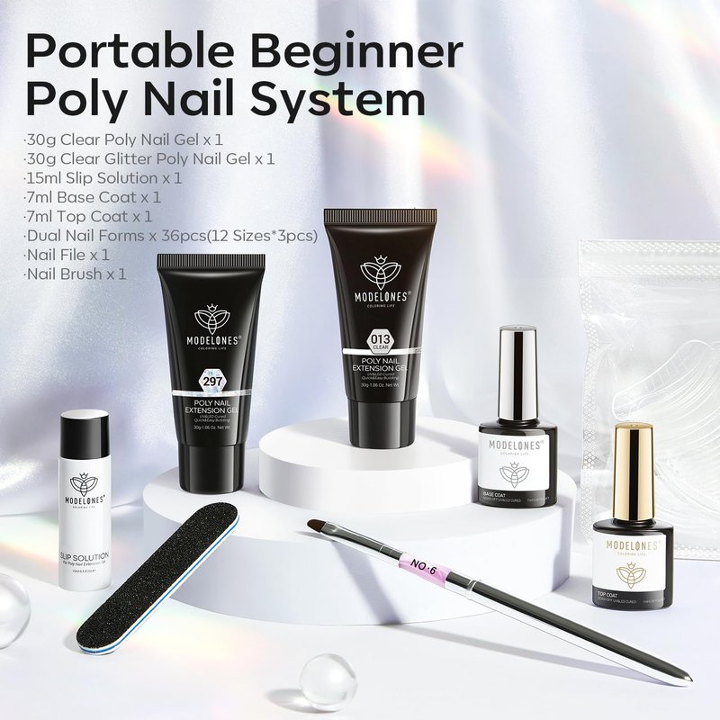 - ❤ 【POLY NAIL GEL KIT】: Big capacity with 30ml poly nail gel, 1*clear color+1*clear glitter color, 1*7ml base coat, 1*7ml top coat, 1*15ml slip solution, 36PCS dual forms (12sizes*3PCS each), 1*nail brush to push the poly nail gel, 1* nail file, 1*package with manual instruction (Notice: Requires a nail lamp to cure which is not contained in the kit).